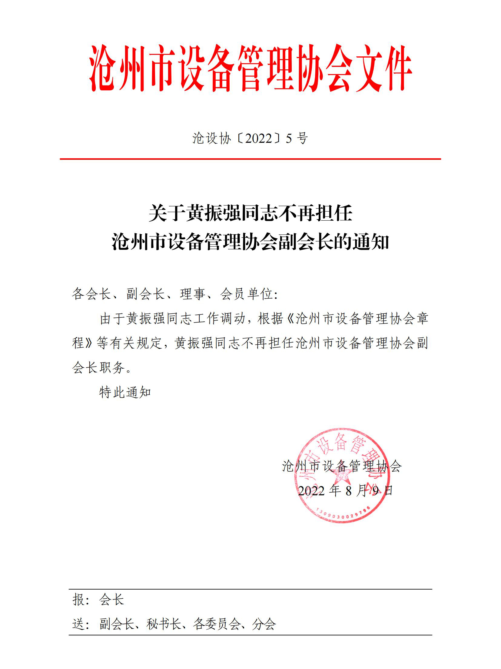 关于黄振强同志不再担任沧州市k8凯发副会长的通知