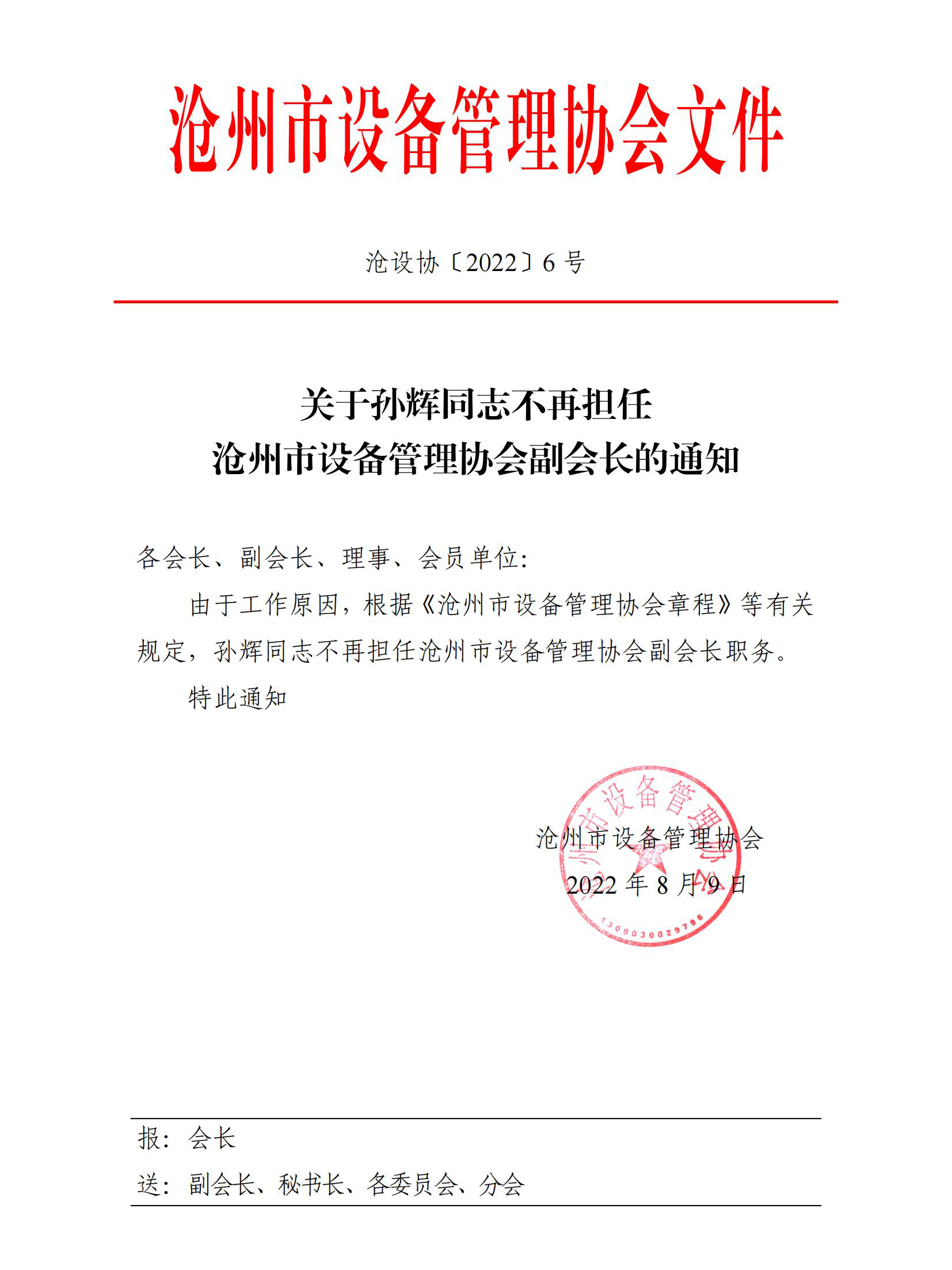 关于孙辉同志不再担任沧州市k8凯发副会长的通知