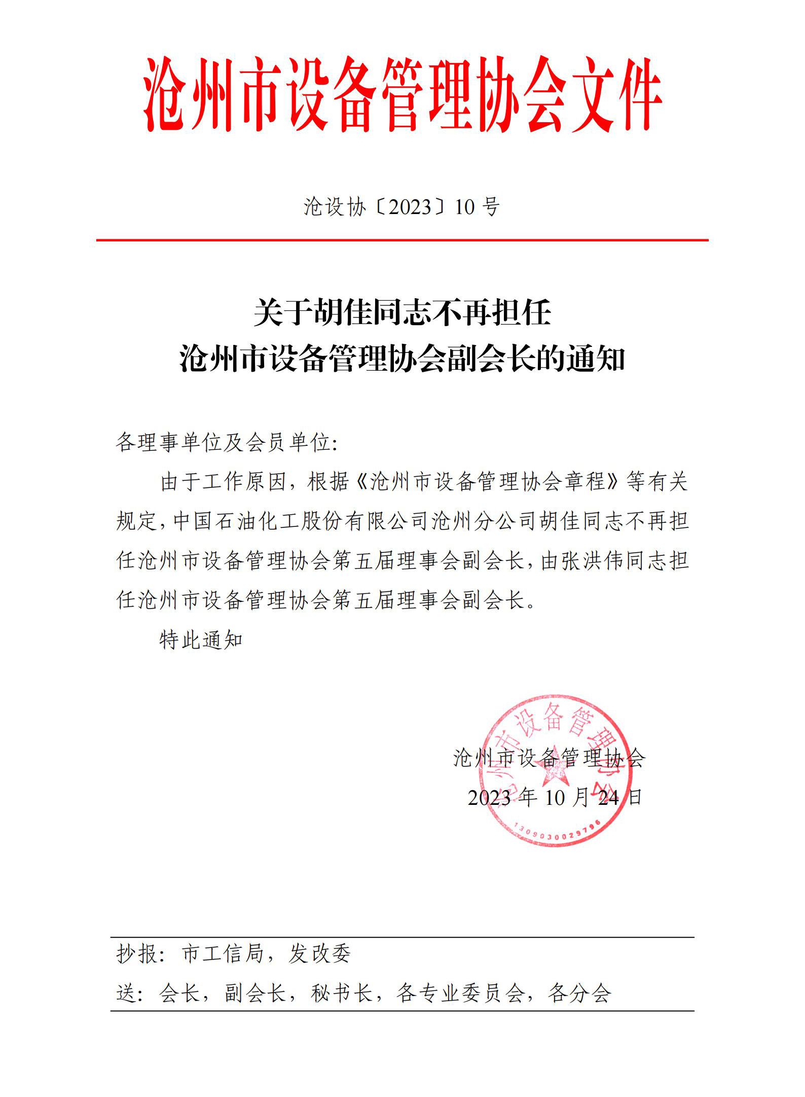 关于胡佳同志不再担任沧州市k8凯发副会长的通知