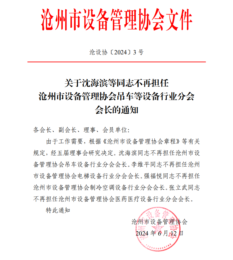 关于沈海滨等同志不再担任沧州市k8凯发吊车等设备行业分会会长的通知