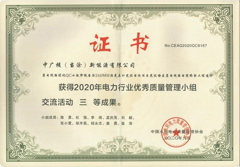 安徽当涂项目取得三项水利电力质量管理协会颁发的QC三等成果。