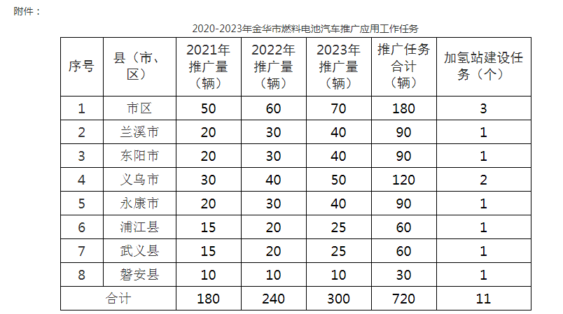 4.争创国家示范城市。加快对燃料电池汽车技术研发和产业化攻关,引进重点龙头企业,形成完善的氢能产业链。加快加氢站等基础设施建设,在婺城区、武义县和金华开发区率先建设3座加氢站。加强技术创新、探索商业模式、丰富应用场景,积极对接省发改、经信、财政、科技等部门,对接相关地市,共同争创国家燃料电池汽车示范应用城市。细化金华市燃料电池汽车示范应用工作任务及配套政策,促进氢能产业健康发展。