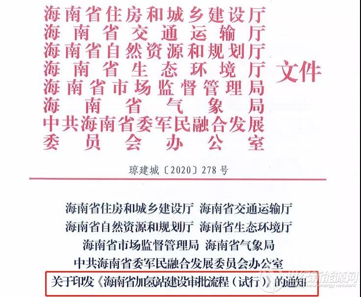 日前,海南省住房和城乡建设厅、海南省交通运输厅、海南省自然资源和规划厅、海南省生态环境厅、海南省市场监督管理局、海南省气象局、中共海南省委军民融合发展委员会办公室联合发布《海南省加氢站建设审批流程(试行)》的通知。