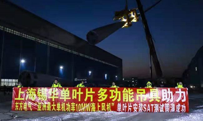 2021年1月14日,白雪皑皑的烟台蓬莱东方电气叶片生产基地内,上海锡华现场测试人员和东方电气技术、工艺、质检、交付中心人员共同为“亚洲最大单机功率10MW海上风机—单叶片安装SAT测试验收”的圆满成功而振臂高呼。