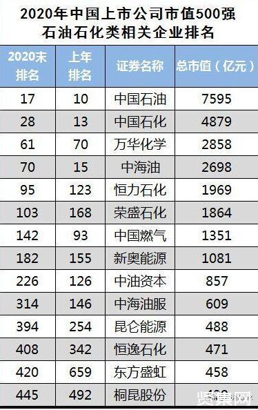 2020年末,中国石油以7595亿元的总市值,位居石油、石化类相关企业榜首、全国500强排名第17。