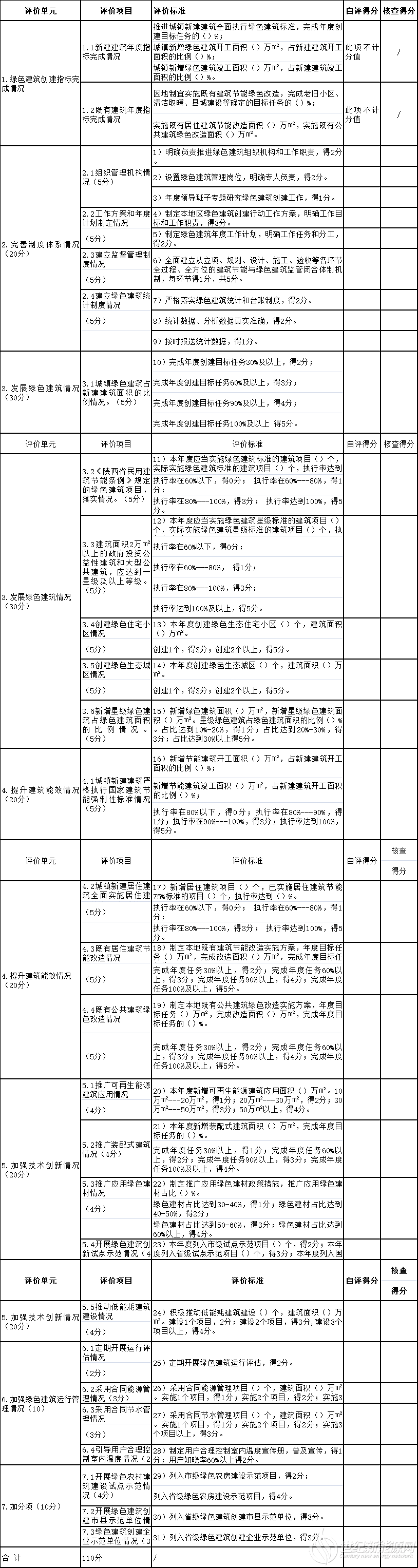 说明:本评价标准适用于对各设区市、县(市)绿色建筑创建行动的自我评价和核查评价,得分作为排名的依据。每季度自我评价上报一次,每半年评价核查一次。